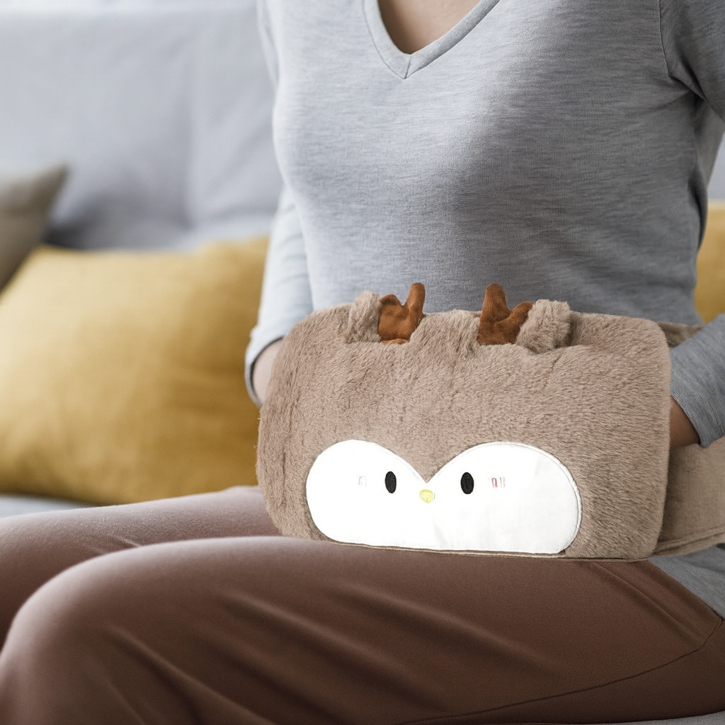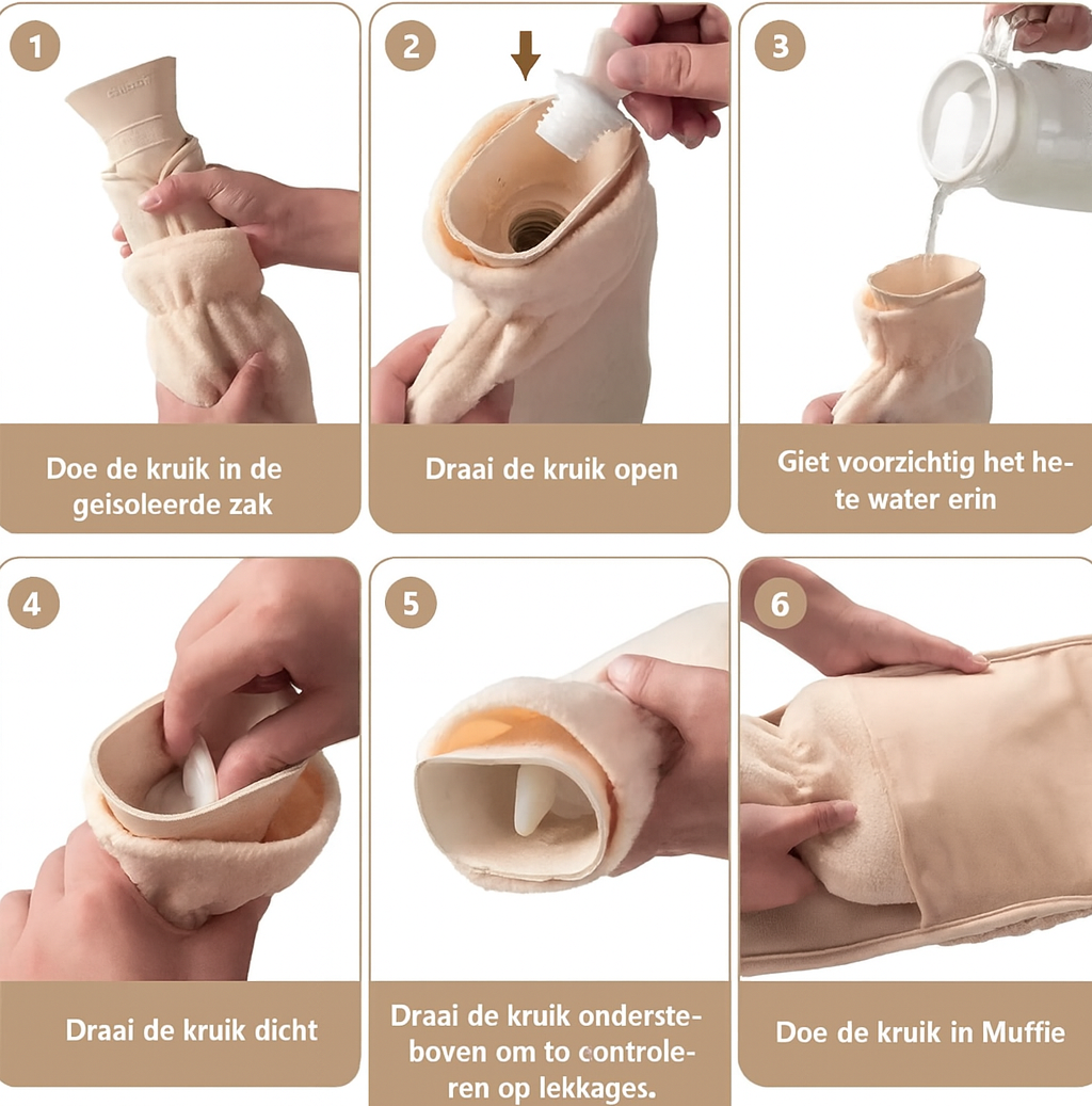 Vul de warmwaterkruik, stop hem in je Hert Wuppie en voel hoe hij je helpt ontspannen.