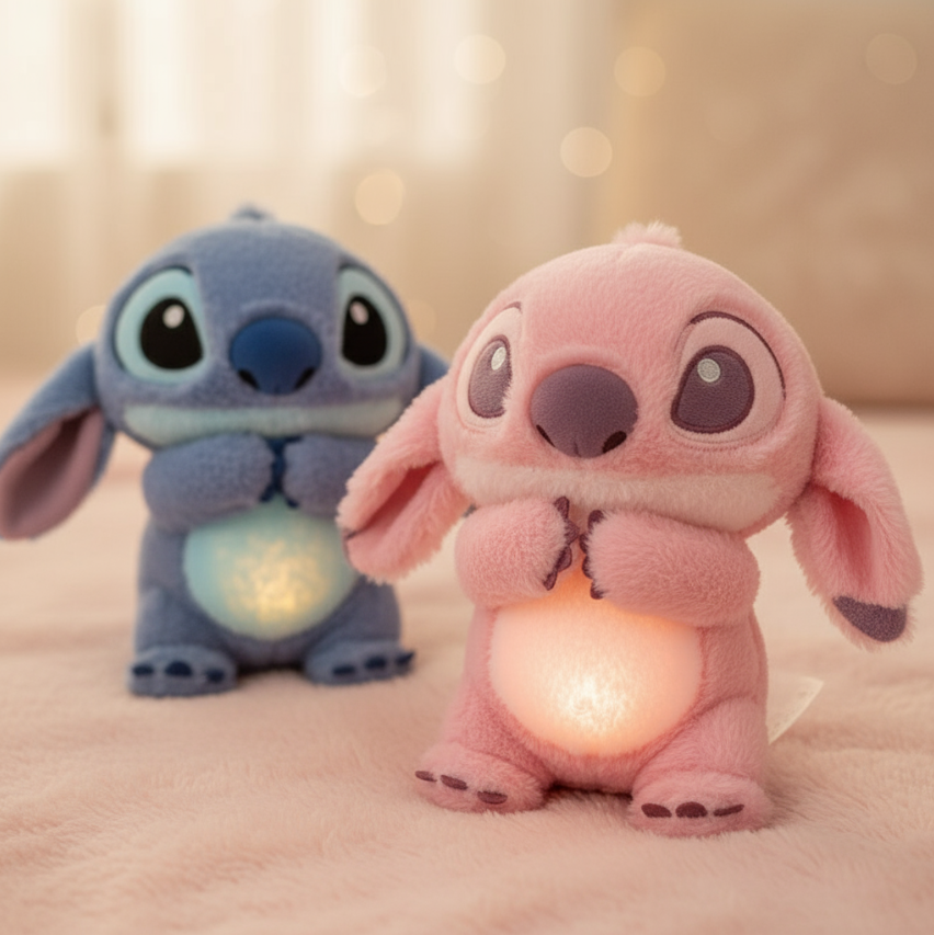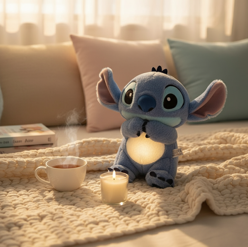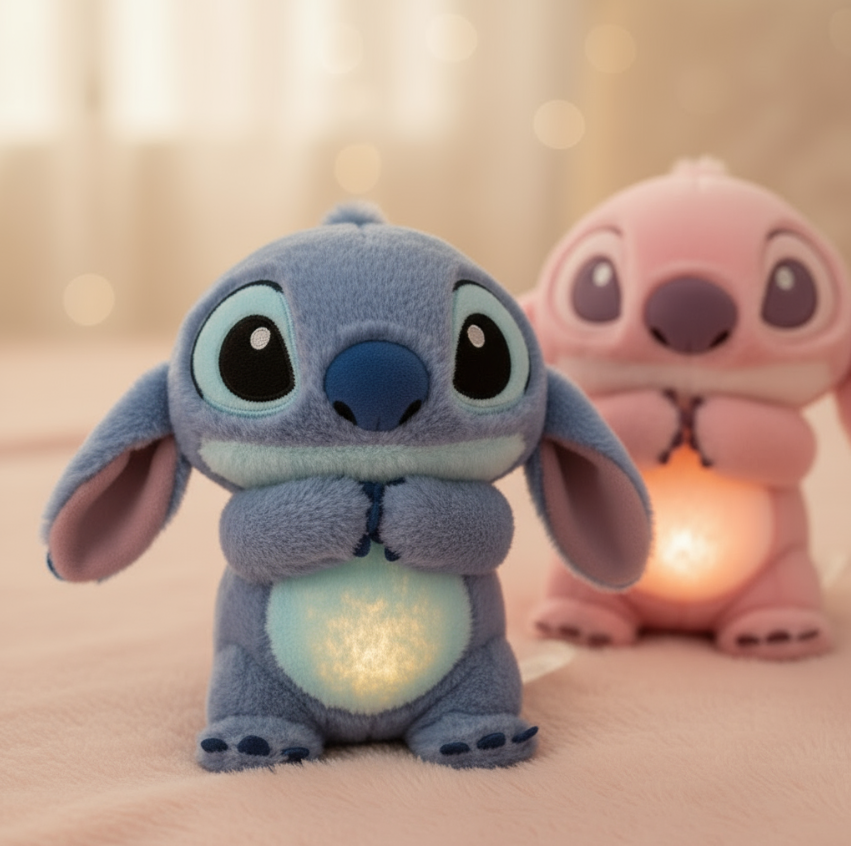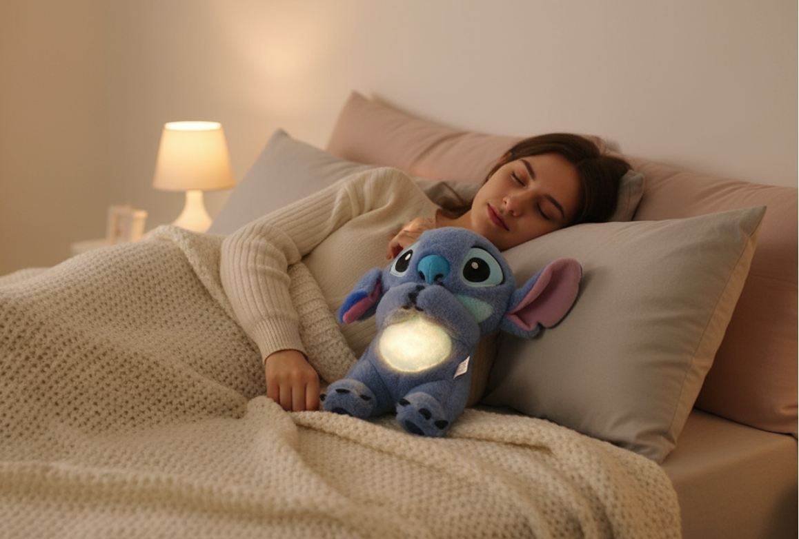 Deze lieve pluche vriend straalt een zacht licht uit en beweegt rustig op en neer, alsof hij ademt — een kalmerend ritme dat je hart vertraagt en je hoofd tot rust brengt.